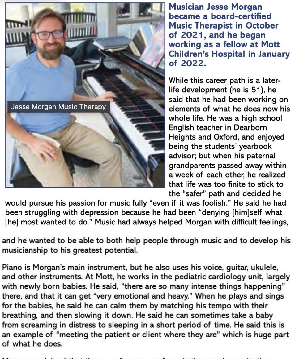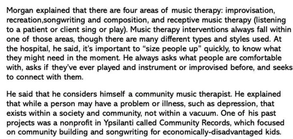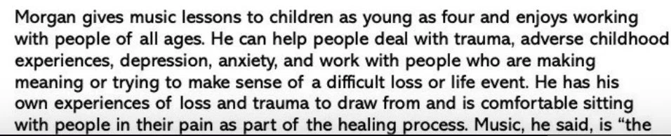 My work is influenced by the work of Carl Rogers, Carl Jung, and Nordoff-Robbins (Paul Nordoff & Clive Robbins), among others. I believe in unconditional positive regard for clients. I believe we often have an idea of how we might heal, although we may not be able to articulate it. I believe our greatest wounds yield our greatest strengths. I believe each of us has a musical self, the part of us that is uniquely responsive to music. I believe our imaginations can be powerful tools for healing. I believe there is hope for a better life, a better world. I believe in savoring beautiful moments. I believe we have much to teach each other. I believe music is a great tool for improving our lives.